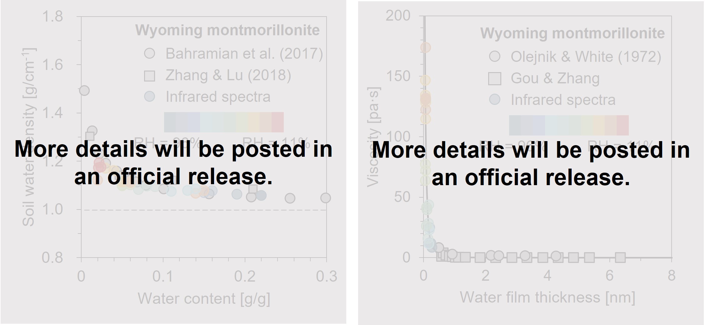 - Adsorptive water in soils exhibits a more structured hydrogen bonding (HB) network compared to bulk water. This structured hydrogen bonding network leads to unique physicochemical features of soil water, such as higher density and viscosity. However, accurately detecting the HB network water in soils remains challenging. In this work, vibrational spectroscopy, i.e., infrared spectroscopy and Raman spectroscopy, is employed to probe pore water structures in soils within a drying-wetting cycle. The obtained spectra are used to quantitatively characterize the water content, density, and viscosity evolution of adsorbed water in soils.